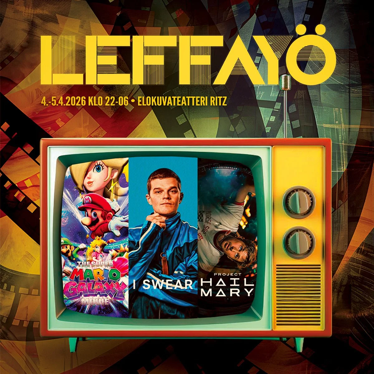 Leffayö järjestetään 4.-5.4.2026 klo 22–06 Elokuvateatteri Ritzissä. Ohjelmistossa kolme uutta elokuvaa. Tapahtuman järjestävät Mikkelin nuorisovaltuusto, Mikkelin nuorisopalvelut ja Mikkelin kulttuuripalvelut.
